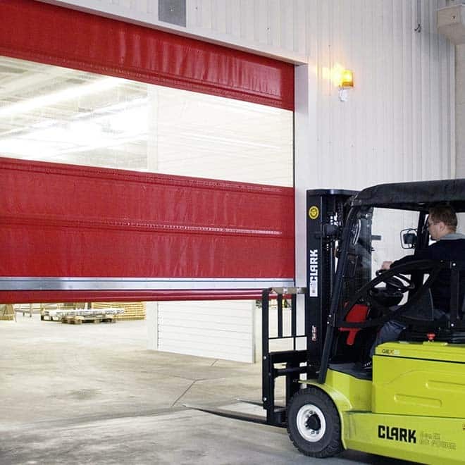 Schnelllauftore mit Kunststoff-Behang wickeln sich wie Rolltore auf und werden oft mit anderen Industrietoren kombiniert. Teckentrup Schnelllauf-Folientore sind für den Innen- und Außeneinsatz geeignet, sichern den Verkehrsfluss und minimieren Energieverluste. Das integrierte Federkraft-Crash-Schutzsystem schützt Personen und Material, vermeidet Schäden und sorgt für schnelle Wiederherstellung der Funktion nach einem Aufprall.